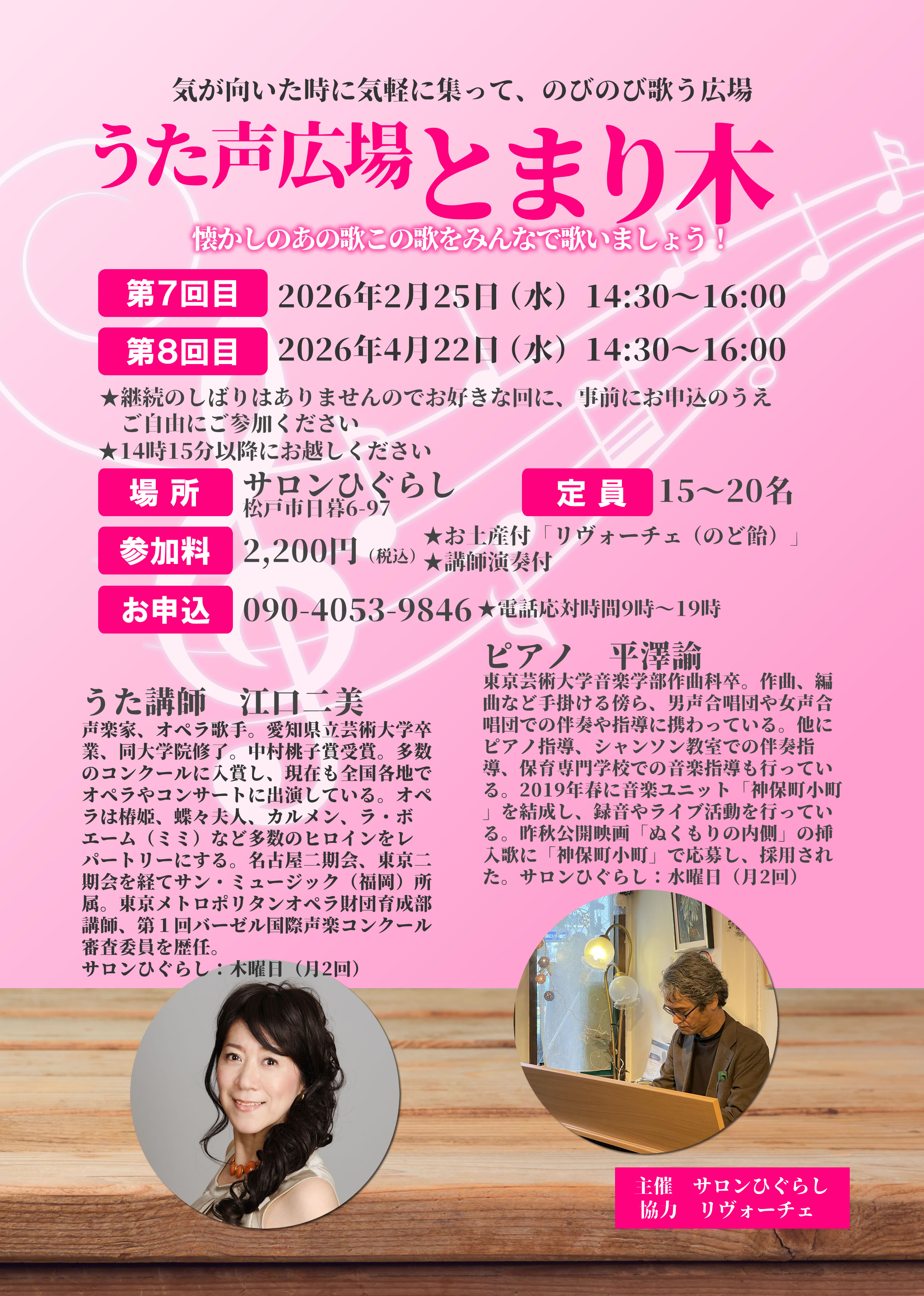 次回は、4月22日(水)14時半〜16時うた講師:江口二美 ピアノ講師:平澤諭 協力:リヴォーチェ